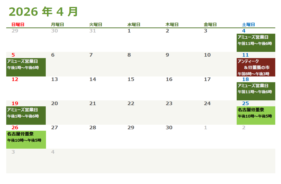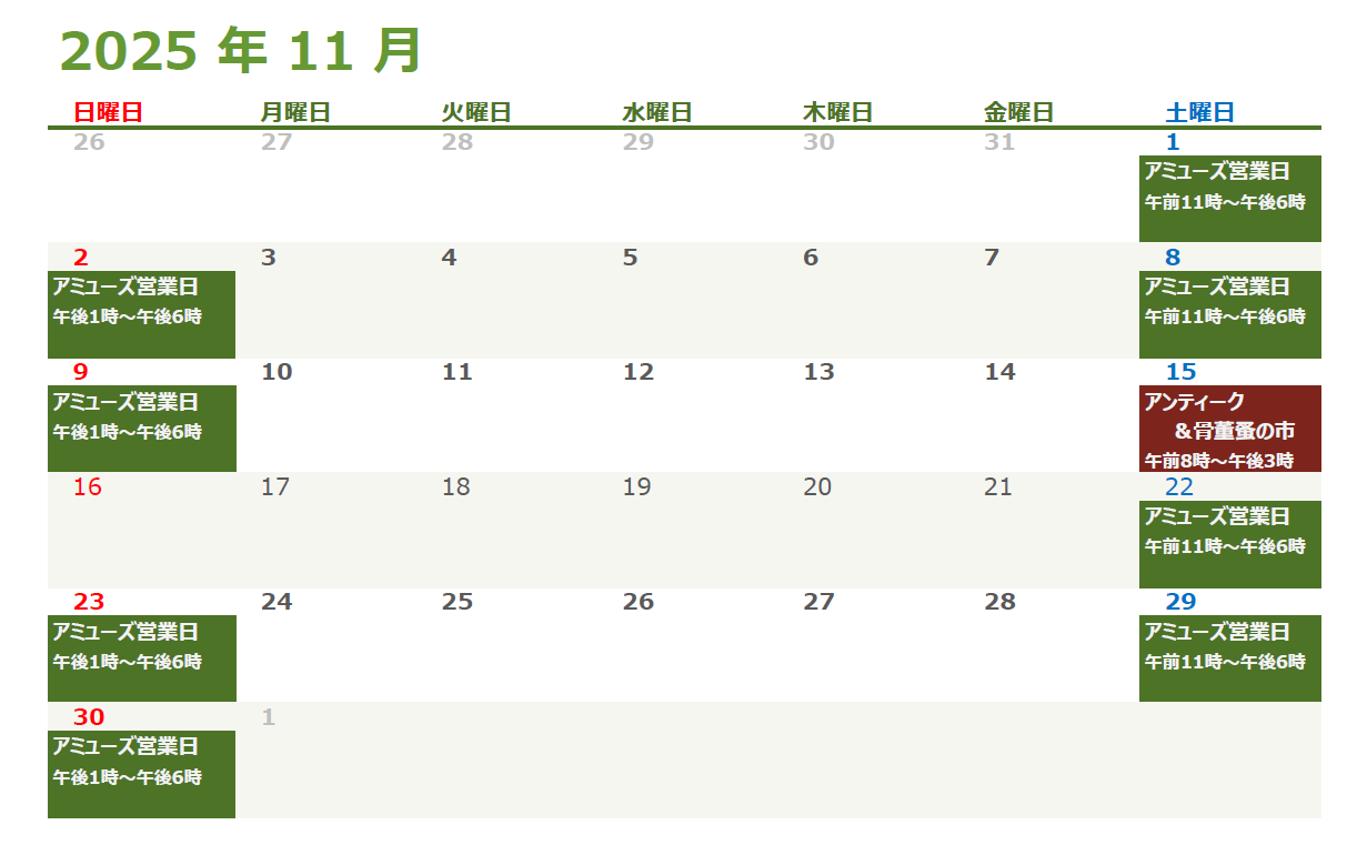アミューズの基本営業日:土曜、日曜(催事休業有り)営業時間→午前11時~午後6時