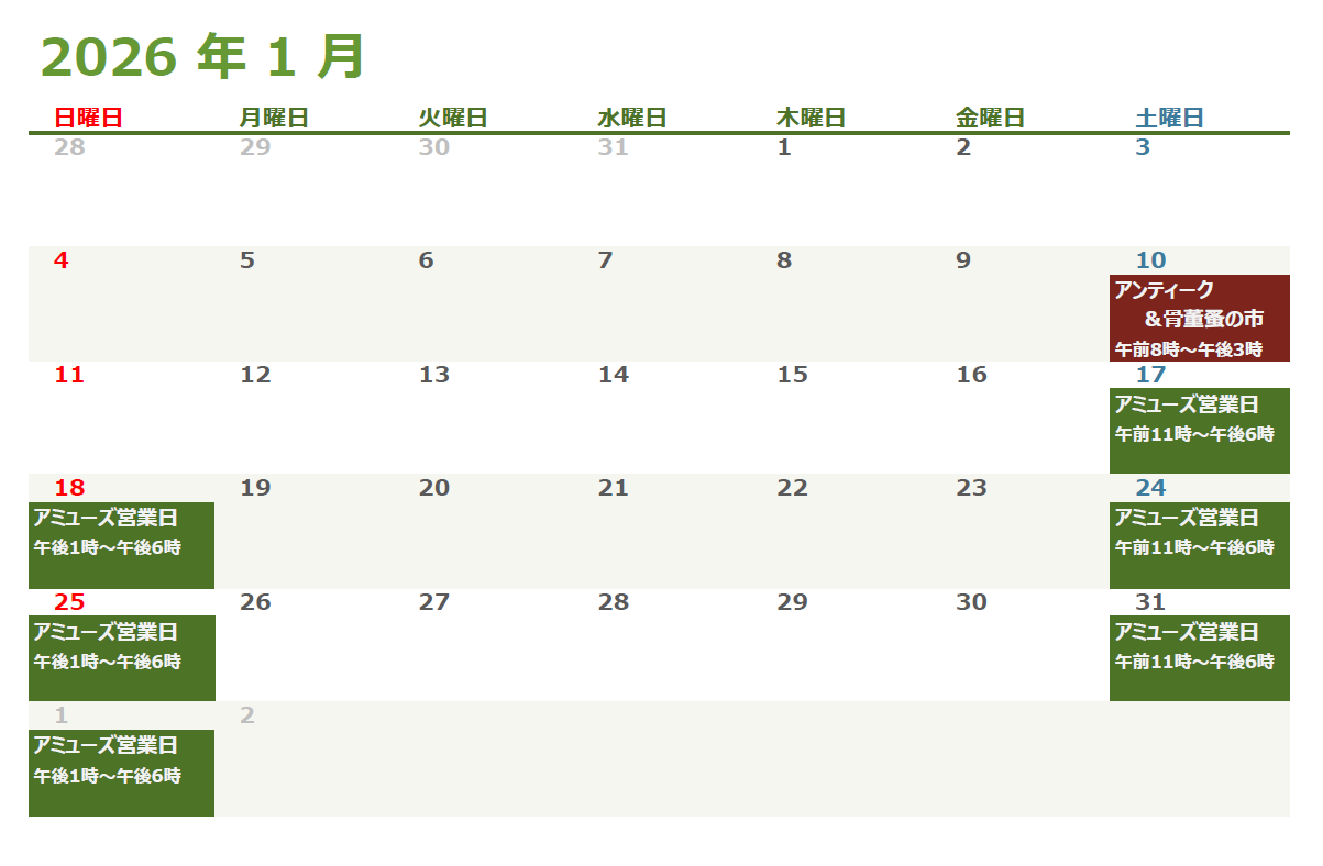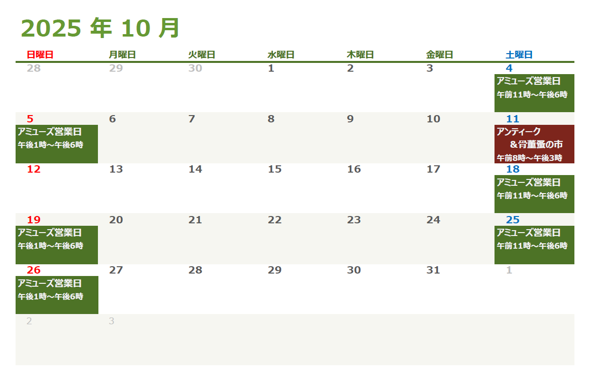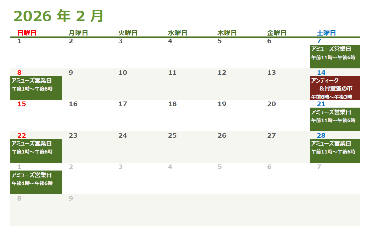 アミューズの基本営業日:土曜、日曜(催事休業有り)営業時間→午前11時~午後6時